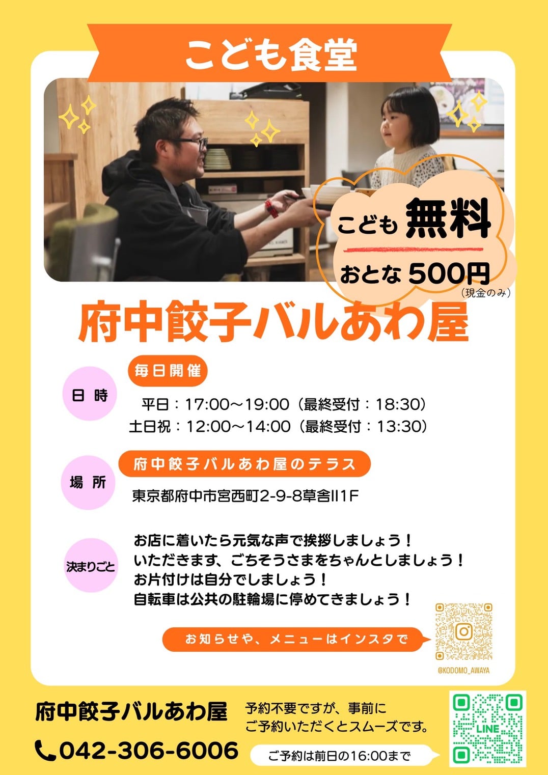 運営する飲食店(府中餃子バルあわ屋)の席を一部開放して「スマイルこども食堂」という名で毎日子供達に無料で食事を提供させていただきます。